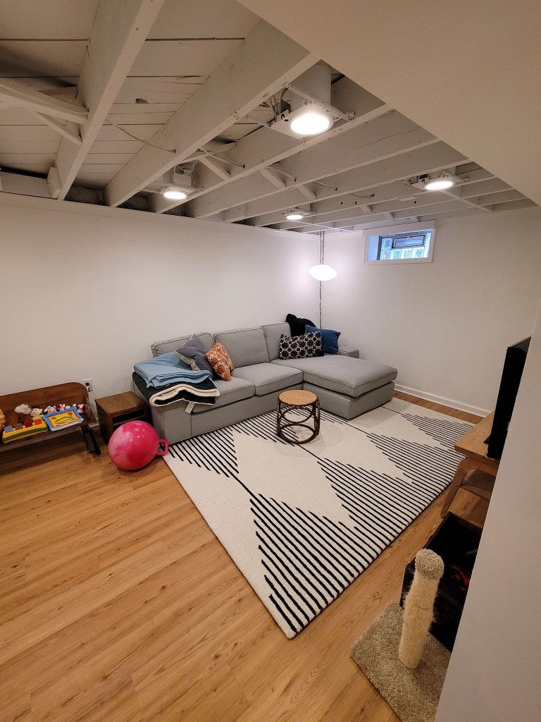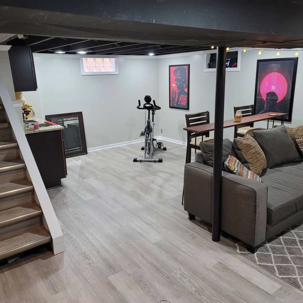 Transform your basement into a functional and inviting space with framed and insulated walls, sleek vinyl plank flooring, and updated lighting. Add a polished look with professionally installed drywall, stylish doors, and trim. A bold black-painted ceiling creates a modern, open feel, while a refreshed staircase completes the transformation.